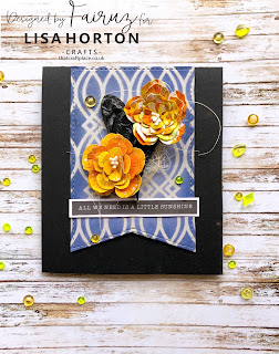To create this card, I chose jet black cardstock as the card base. Then cut out a cool grey panel using Lisa’s nested flag dies and did some stenciling using Lisa Horton Crafts Medieval stencil & distress ink (shades- shaded lilac & chipped sapphire). After attaching the panel on the card base, I added a greyboard heart embellishment stenciled with the same medieval stencil and colored in black in the center and topped it with two bright yellow paper flowers. To add some more interest, I used some sisal beneath it and some yellow stones as embellishments. Finally finished off the card with the perfect sentiment “All We Need Is A Little Sunshine” from Lisa’s Wordage Sentiments.